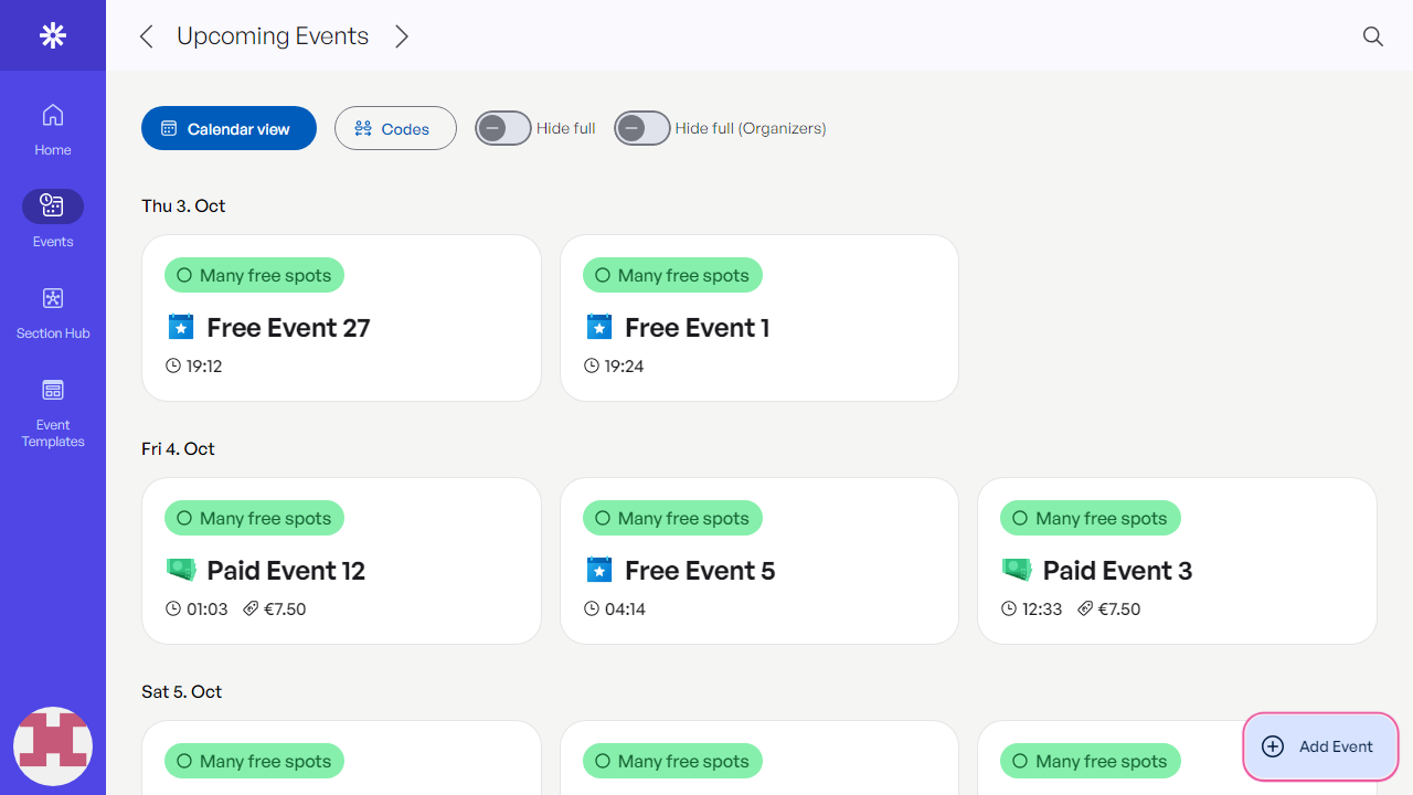 To create an event, you first have to select a template. Click on the Add Event button to get started.