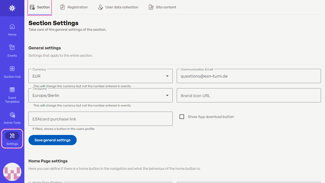 In the tenant management you can change all settings that are relevant globally. The different configurable parts will be explained in the following. To do this, select the Settings item in the navigation bar. And then select the Section tab.